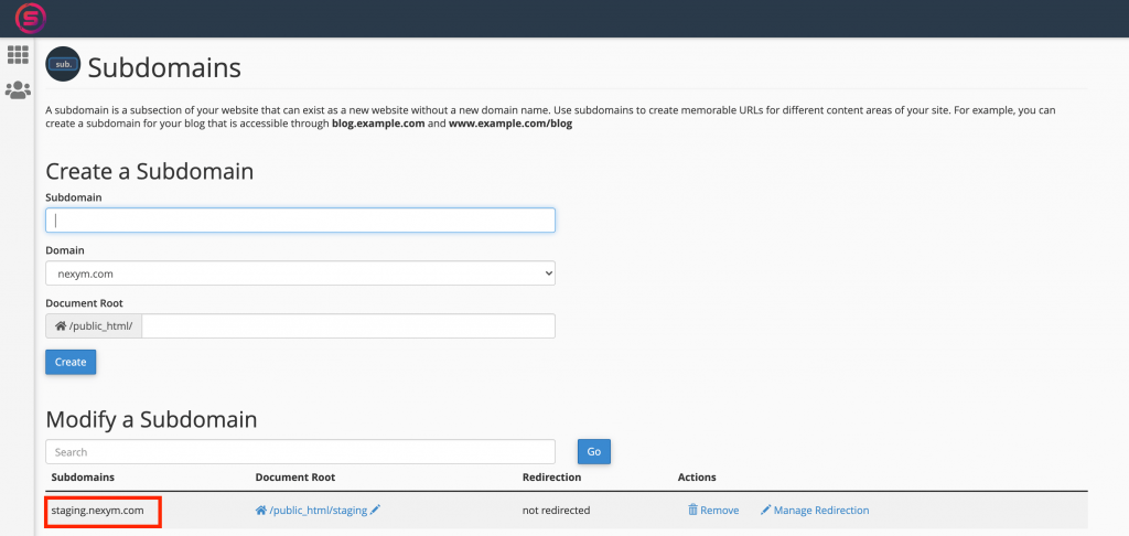 Once your subdomain is created, you’ll see it listed under Subdomains.