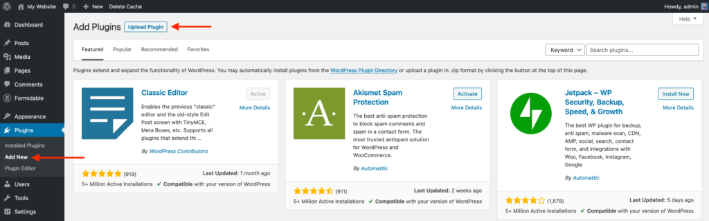 Log in to your WordPress dashboard, head to Plugins > Add New, and click the Upload Plugin button on top:
