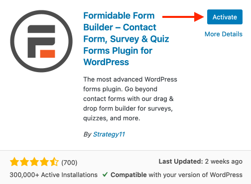 Once installed, click Activate to activate the Formidable Form Builder plugin: