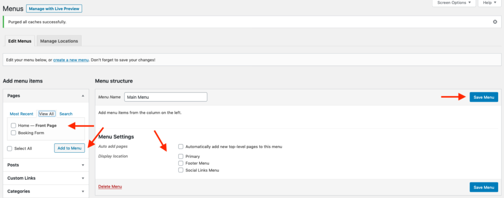 On the left side, select all the pages you want to add to the menu and click the Add to Menu button. Select the menu position and click the Save Menu button to save the changes.