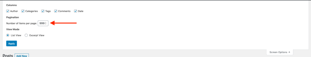 Once the plugin is activated, you need to re-save each post for it to go through them and replace images. To avoid doing the process manually, go to Posts > All Posts, click the Screen Options option at the top-right corner, and set the Number of items per page option to 999.