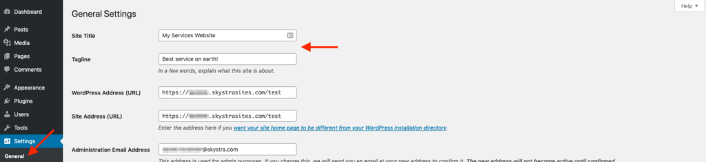 Then go to the Settings > General, and set your Site Title and Tagline: