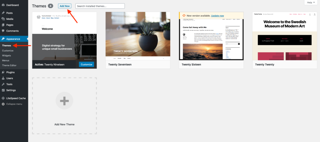 To search and install themes, head to the Appearance > Themes section of the WordPress dashboard, and click on the Add New button.