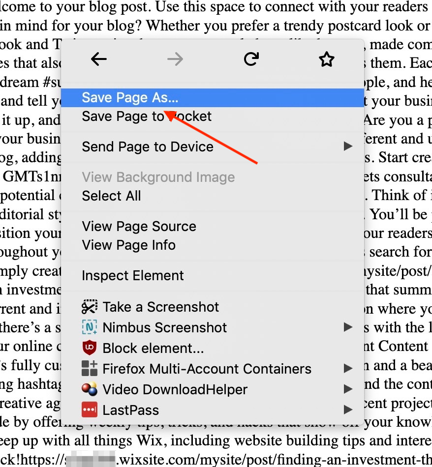 Once you access your Wix RSS URL, you’ll see a page full of code. Right-click your mouse anywhere on the page, and select the Save As (or Save Page As in Firefox) option and save the file.
