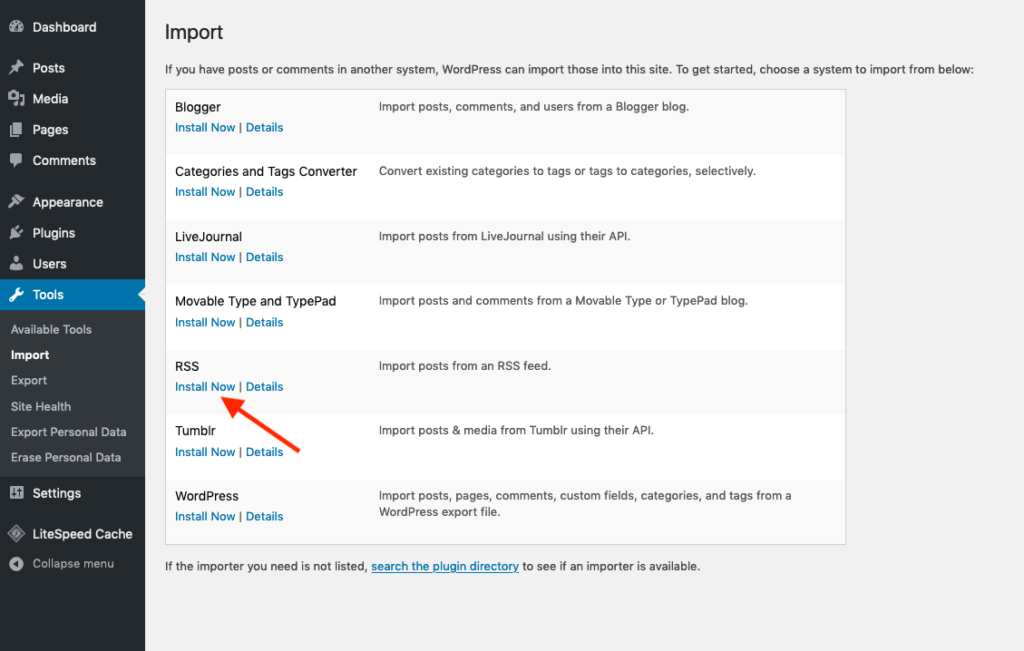 Once you download the file, head back to your WordPress dashboard > Tools > Import option and click the Install button under the RSS option.